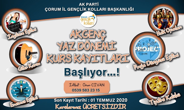 Ak Parti Çorum İl Gençlik Kolları Başkanlığı yaz kurslarının 1 Temmuz tarihi itibariyle başlayacağını duyurdu. 1 Temmuz itibariyle başlayacak kurslarda İngilizce eğitiminin yanı sıra Gitar Kursu, Halk Oyunları Kursu, Avrupa Birliği projeleri ve Erasmus + programı için sertifikalı proje yazma döngüsü eğitimi ve Genç Sanatçı Çorum Tiyatro Topluluğu gibi kursların açılacağı belirtildi. Ak Parti Çorum İl Gençlik Kolları Başkanı Muhammed Fatih Temur’un yaptığı yazılı açıklamaya göre kurslar 1 Temmuz ‘da başlayacak ve yaz boyunca devam edecek. Maske, Mesafe ve Temizlik kurallarına riayet ederek gerçekleştirilecek olan kurslara ise katılım şartı ilgi duymak ve genç olmak olarak belirlendi. İşte Temur’un Açıklamalarından satır başları;