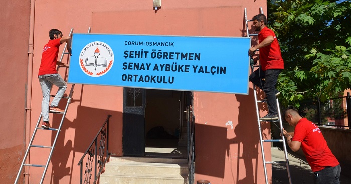 Batman’ın Kozluk ilçesinde teröristlerin saldırısında şehit olan müzik öğretmeni Şenay Aybüke Yalçın’ın adı, memleketi Çorum’un Osmancık ilçesindeki bir okula verildi. Batman’ın Kozluk ilçe merkezinde, önceki gün daha önceden gasp ettikleri ve içerisine patlayıcı yerleştirdikleri ticari araçtan inen teröristler, belediye başkanının aracına uzun namlulu silahlarla saldırı düzenlemişti. Saldırıda, 4 öğretmen arkadaşı ile birlikte başka bir araçla olay yerinden geçen ve Ekim 2016’da ilçeye müzik öğretmeni olarak atanan 23 yaşındaki Şenay Aybüke Yalçın, kurşunların hedefi olarak yaralanmıştı. Ağır yaralı olarak İlçe Devlet Hastanesine kaldırılan Yalçın, burada yapılan müdahalelere rağmen kurtarılamayarak şehit olmuştu.