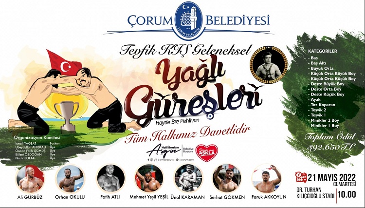 Çorum Belediyesi pandemi sonrası spor faaliyetlerine de hız verdi. Çorum Belediyesi kültür-sanat faaliyetlerinin yanı sıra spor etkinliklerine de ara vermeden devam ediyor. 2022 yılının başından bu yana farklı branşlarda Türkiye Şampiyonasına ev sahipliği ve öncülük yapan Çorum Belediyesi, bu kez yağlı güreş organizasyonu düzenliyor. 21 Mayıs Cumartesi günü Dr. Turhan Kılıçcıoğlu Stadyumu’nda düzenlenecek organizasyona Ali Gürbüz, Orhan Okulu, Fatih Atlı, Mehmet Yeşil Yeşil, Ünal Karaman, Serhat Gökmen ve Faruk Akkoyun gibi altın kemerli başpehlivanların da içinde olduğu 32 başpehlivan ile büyük bir organizasyona ev sahipliği yapacaklarını kaydeden Belediye Başkanı Dr. Halil İbrahim Aşgın, tüm güreş severleri bu tarihi müsabakaları izlemeye davet etti.