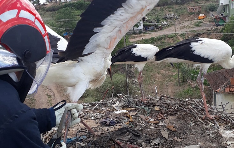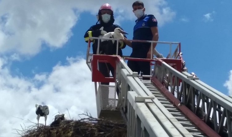 Çorum’un Bayat ilçesinde ayağına ip takılan leylek, itfaiye ekiplerince kurtarıldı.