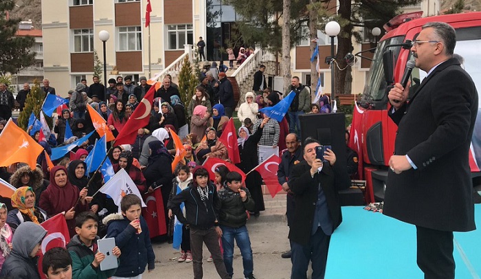 AK Parti İl Başkanı Yusuf Ahlatcı, MKYK Üyesi Milletvekili Ahmet Sami Ceylan,Önceki Dönem Milletvekili Adnan Türkoğlu ve yönetim kurulu üyeleri ile birlikte Uğurludağ ilçesinde anahtar teslim törenine katıldı. Anahtar teslim töreninden bir konuşma yapan Ahlatcı; sevgili Uğurludağlılar hepinizi sevgi ve saygı ile selamlıyorum. Ak Parti demek Tevazu demek, Ak Parti demek Gayret demek, Ak Parti demek Samimiyet demek, Ak Parti demek Uğurludağ’a Hizmet demek, Ak Parti demek Recep Tayyip Erdoğan demektir. Uğurludağ ilçe halkımızın yaşam kalitesini yükseltmek için Toki Daire Başkanlığımızın ilçemizde yaptığı 102 konut ve 12 dükkanın ev ve iş yeri sahiplerine anahtarlarını teslim etmek, belediyemizin ihtiyacı olan aracı teslim etmek ve siz vatandaşlarımızın evlerinde rahat edebilmesi için başlattığımız doğalgaz fizibilite çalışmamızı sizlere bizzat iletmek için buradayız. Söz verdik ve yapıyoruz. Uğurludağ ilçemize siz kıymetli vatandaşlarımıza hayırlı uğurlu olsun. Bizim için asıl olan milletimizin gönlünü kazanmaktır,.31 Mart’ta milletimizin karşısına “memleket işi, gönül işi” diyerek çıkmamızın sebebi işte budur.Çok uzun yıllar davamız uğruna hiçbir zorluğa karşı boyun eğmeden dik duruşumuzla, Allah’a hamd olsun davamızın bu onurlu mücadelesini verdik. İstikrar ve güven ortamının güçlü bir şekilde devamına ihtiyacımız var. Milletimizin 31 Mart’ta bize bu fırsatı bir kez daha tanıyacağına yürekten inanıyorum. Yeter ki milletimiz bize destek olsun bize inansın biz milletimize hizmet için gece gündüz çalışmaya hazırız. Milletimiz varsa biz varız, milletimiz mutluysa biz de mutlu, milletimiz hüzünlüyse biz de hüzünlüyüz. Bizim işimiz milletimize hizmet bizim işimiz gönül işi biz milletimizle biriz biz milletimizle diriyiz, biz milletimizin desteğiyle varız.’’dedi. Değerli hemşehrilerim aynı coşkuyu inşallah Allah’ın izniyle sizin de desteğinizle 31 Mart’ta da bu meydan da yaşayacağız.