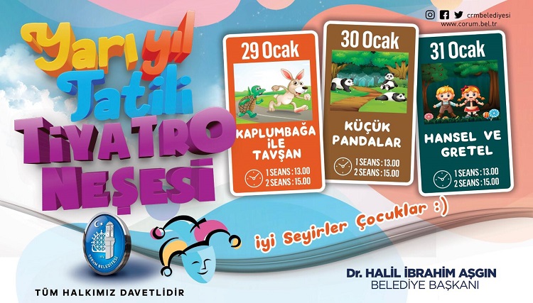 Çorum Belediyesi, kültür sanat etkinlikleri kapsamında çocuklara yönelik tiyatro gösterisi düzenleyecek. Yarıyıl tatiline giren öğrencilere yönelik gerçekleştirilecek olan tiyatro oyunu 3 gün boyunca Buhara Kültür Merkezinde sahnelenecek. 7’den 70’e herkese yönelik kültür ve sanat etkinlikleri düzenlediklerini söyleyen ve yarıyıl tatiline giren çocuklara bir karne hediyesi olarak düzenledikleri tiyatro gösterisine tüm çocukları davet eden Belediye Başkanı Dr. Halil İbrahim Aşgın, “Eğitim öğretim yılının ilk yarısında yorulan öğrencilerimiz için yarıyıl tatili başladı. Biz de Çorum Belediyesi olarak öğrencilerimizin tatillerini renklendirmek, onları hem eğlendirmek hem de dinlendirmek amacıyla çeşitli etkinlikler düzenliyoruz. Yavrularımız doyasıya eğlenecek” dedi. Buhara Kültür Merkezi’nde 29 Ocak Çarşamba Kaplumbağa ile Tavşan, 30 Ocak Perşembe Küçük Pandalar ve 31 Ocak Cuma günü Hansel ve Gretel oyunları sahnelenecek. Belediye Başkanı Dr. Halil İbrahim Aşgın, tüm çocukları tiyatro oyununa davet etti.