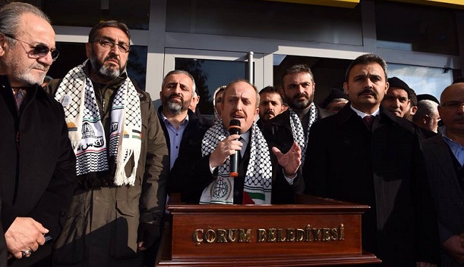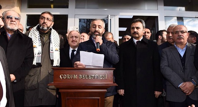 ABD’nin Kudüs’ü İsrail’in başkenti kabul etme kararına tepkiler çığ gibi büyüyor. Türkiye genelinde olduğu gibi Çorum’da da bugün Cuma namazının ardından protesto eylemi düzenlendi. İnsani Değerler Platformu tarafından organize edilen protesto eylemine, sivil toplum kuruluşları, AK Parti Çorum Milletvekili ve TBMM İdare Amiri Salim Uslu, Belediye Başkanı Muzaffer Külcü, AK Parti İl Başkanı Mehmet Karadağ, sivil toplum kuruluşlarının temsilcileri ile çok sayıda vatandaş katıldı. Kur’an-ı Kerim tilaveti ile başlayan protesto eyleminde İHH Çorum Şubesi Başkanı Selim Özkabakçı açıklama yaptı. İnsani Değerler Platformu Başkanı Zeki Kambur’un kısa açıklamasının ardından da AK Parti İl Başkanı Av. Mehmet Karadağ söz aldı. Karadağ, Cumhurbaşkanı Recep Tayyip Erdoğan’ın Kudüs davasına sahip çıkılması noktasında tüm teşkilatlara Cuma Namazı sonrasında sivil toplum kuruluşlarıyla protesto eylemine katılmaları talimatını verdiğini hatırlattı. Karadağ, Cumhurbaşkanı Erdoğan tarafından gönderilen metni okudu. Konuşmaların ardından da hep birlikte dua edildi.