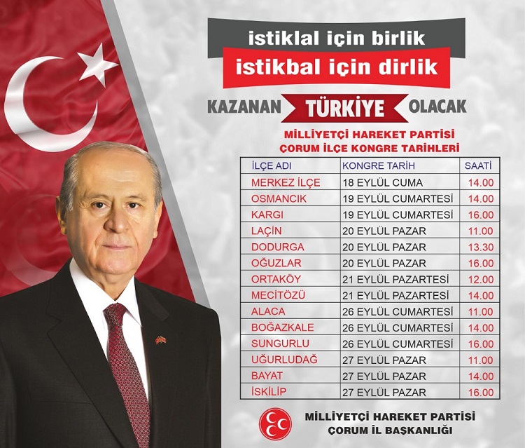 Bilindiği gibi aynı gerekçelerle kurultay sloganımız “İstiklal için birlik, istikbal için dirlik” olarak belirlenmiş ve bu konsepte bir de “Kazanan Türkiye olacak” mottosu eklenmiştir. O itibarla ilçe kongrelerine Genel Merkezimizden onayı alınan dava arkadaşlarımızla birlik ve bütünlük içerisinde gidilecektir. Çorum İl Başkanlığı olarak kongreleri 18 Eylül Cuma günü Merkez İlçemiz ile başlatıyoruz. Kongrelerimizi 27 Eylül’de 9 günlük süre zarfında inşallah tamamlamış olacağız. Milliyetçi Hareket Partisi Kongresi bir siyasi organizasyonun yasal zorunluluğundan öte çok daha büyük anlam ifade etmektedir. Türk Milliyetçilerinin son kalesi olan Milliyetçi Hareket Partisi, Anadolu coğrafyasında olduğu kadar Türk dünyasının ve bütün gönül coğrafyamızın yeniden dirilişi için yegane umududur.