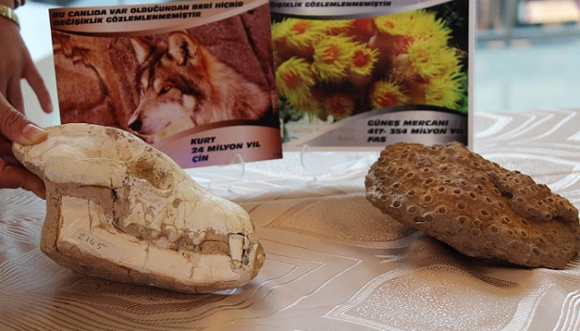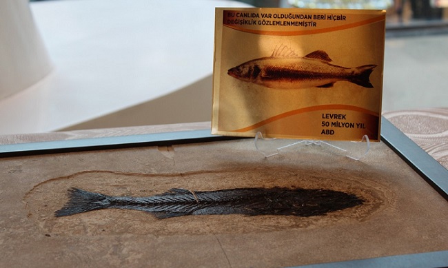 Sergimizde kullanılan fosiller çeşitli canlı gruplarından oluşmaktadır. Bunlar Siyanobakteri fosili, Aslan kafatası fosili, kurt kafatası, Vatos çeşitli hayvan ve bitki Fosilleri den oluşan 20den fazla fosil vardır. Bunlardan en önemlisi Siyanobakterilerinin oluşturduğu 2.2-2.4 Milyar yıllık Stromatolıte Fosili. İlk tek hücreli canlı olmasına rağmen biyoloji saatte sahip güneşin konumuna göre Fotosentez ve Azotu fiksasyon yapabilme gibi birbirinden Çok farklı işlemleri tek bir hücrede yapabilen çok kompleks bir canlıdır günümüzdeki Siyanobakteriler ile 2.4 milyar yıllık Siyanobakteriler aynıdır.