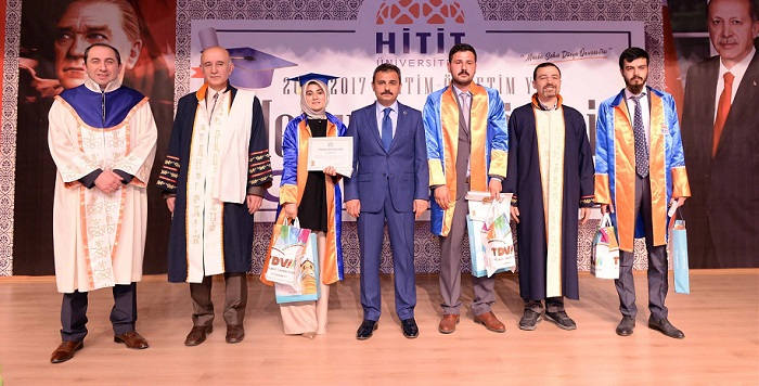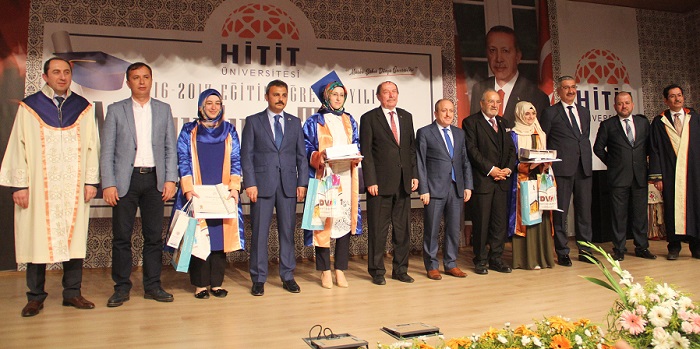 Hitit Üniversitesi’nin 10 yıl sonra nerede olacak?’ diye sorsalar, ‘Bilmiyorum’ cevabını veririm” diyen Alkan, “Öğrencilerimiz 10 yıl sonra neredeyse bizler de oradayız. Bilin ki yapamayacak hiçbir şey yok. Antarktika’da 3 tane üniversite var. Hitit Üniversitesi, İstanbul Teknik Üniversitesi, Karadeniz Teknik Üniversitesi var. Peki nasıl oluyor bu? Eğer doğru yöntemi deneyecek olursanız aradaki açığı kapatabilirsiniz. Şuan itibariyle 18 bin öğrenciye ulaştık. Bin 100 adet personelimiz var. 8 fakültemiz, 2 tane yüksekokulumuz, 6 tane meslek yüksekokulumuz, 3 tane enstitümüz ve 14 tane merkezimizle her geçen gün büyümeye devam ediyoruz. İnşallah gelecekte daha güzel çalışmalara da imzalar atacağız” şeklinde konuştu. Diğer protokol üyelerinin de konuşmalarının ardından üniversiteyi dereceyle bitiren öğrencilere diplomaları protokol üyeleri tarafından verildi. Tören sonunda keplerini fırlatarak mezuniyetin tadını doyasıya yaşayan öğrenciler, ailelerine sarılarak mutluluklarını paylaştılar.