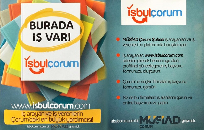 Çorum MÜSİAD tarafından faaliyete geçirilen ‘’İŞ BUL ÇORUM’’ iş arayanı ve işvereni bir araya getiriyor. MÜSİAD Çorum Şubesi Başkanı M. Ahmed Köksal konuyla ilgili açıklama yaparak ‘’İş Bul Çorum’’ hakkında bilgilendirmede bulundu. İşveren ve iş arayanların taleplerine daha hızlı karşılık bulabilmek adına böyle bir çalışmayı faaliyete soktuklarını belirten Çorum MÜSİAD Başkanı M. Ahmed Köksal; insanların bu internet sitesini kullanarak kolaylıkla iş bulabileceklerini kaydetti. Köksal, ‘’İş Bul Çorum isimli internet sitemizi faaliyete geçirdik. Sıkı bir çalışmanın ardından faaliyete geçirdiğimiz bu internet sitesi sayesinde hem işveren hem de iş arayan insanları bir araya getirmiş olacağız. Çorum’a fayda sağlayacak her türlü çalışmayı yapma gayreti göstermekteyiz. İş verenler kendilerine uygun çalışanı bulma konusunda biraz sorun yaşıyorlardı. Tabi iş arayanlarda istedikleri işi bulma konusunda zorluk çekiyordu. Biz bu internet sitesi ile bu sorunu aşacağımıza inanıyoruz. Buradan şunu özellikle vurgulamak istiyorum. Çorum’da faaliyet gösteren tüm işletme sahipleri ve iş arayan kardeşlerimiz mutlaka bu internet sitemizi ziyaret ederek buradan en üst seviyede yararlansınlar.