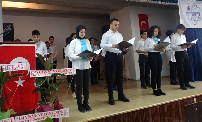 Saygı duruşu ve istiklal marşı okunmasının ardından İlçe Milli Eğitim Müdürü Süleyman Atcıoğlu öğretmen ve öğretmenliği konu eden bir konuşma yaptı. Öğretmenlik mesleğine yeni başlamış öğretmenlerin İskilip Danişmend Fen Lisesi Almanca Öğretmeni Burak Bilgili eşliğinde yemin töreni yapmaları ile devam eden etkinlikte, emekli olmuş öğretmenlere İlçe Milli Eğitim Müdürü Süleyman Atcıoğlu tarafından hizmet şeref belgesi ve plaket takdimi gerçekleştirildi. Emekli öğretmen Mustafa Güneş yaptığı konuşmasında günümüz ve geçmiş öğretmenlik pozisyonu ile yaşanılan sıkıntılar ve okullardaki yenileşmelerden bahsetti. İskilip Danişmend Fen Lisesi öğrencilerinden oluşturulan koro sevilen şarkıları söyledi. Oratoryo ise öğretmen ve öğretmenlik konulu sunumu gerçekleştirdi.