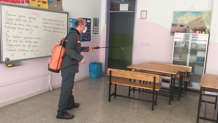 İsmail Kakaç İlkokulu’nda, Koronavirüs tedbirleri nedeniyle hijyen çalışmaları artırıldı. İsmail Kakaç İlkokulu’nda rutin temizlik faaliyetlerinin yanında tedbir olarak hijyen çalışmaları da arttırıldı. Sağlıklı bir nesil ve kaliteli bir eğitim için öncelikle eğitim ortamlarının sağlıklı ve hijyenik olmasını gerektiğini vurgulayan Okul Müdürü Ender Özcan Özçakır, okulda yapılan normal temizlikten sonra her gün düzenli olarak hijyen çalışmaları da yaptıklarını belirtiyor. Sağlık Bakanı Dr. Fahrettin Koca, ülkemizde henüz bir vaka görülmemiş olsa da salgının kapımıza dayandığını ve ülkemize yurt dışından gelenlerin kurallara uyması gerektiğini ediyor. Sağlık Bakanlığı’ndan yapılan açıklamada yeni koronavirüsün, hasta kişilerin öksürme veya hapşırmayla ortaya saçtığı damlacıkların ortamdaki diğer bireylerin ağız, burun ve gözlerine temasıyla, damlacıkların yapıştığı yüzeylere dokunduktan sonra ellerin ağız, burun veya göze götürülmesiyle bulaştığı belirtildi. Ayrıca hastalığın en çok karşılaşılan belirtileri arasında ateş, öksürük ve solunum sıkıntısı olduğu, şiddetli vakalarda zatürre, ağır solunum yetmezliği böbrek yetmezliği ve ölüm gelişebildiği yeni koronavirüsün kuluçka süresinin 2 ila 14 gün arasında olduğu bildirildi. Hastalıktan korunmak için yapılabilecekler: Öksürme veya hapşırma sırasında ağız ve burun tek kullanımlık mendille kapatılmalı, mendil yoksa dirseğin iç kısmı kullanılmalı, tokalaşma ve sarılmadan kaçınılmalı, olabildiğince kalabalık ortamlardan uzak durulmalı, kirli ellerle ağız, burun ve gözlere dokunulmamalı. El hijyenine önem verilmeli. Eller en az 20 saniye boyunca sabun ve suyla yıkanmalı, sabun ve suyun olmadığı durumlarda alkol içerikli el antiseptiği kullanılmalı. Sınıflar ve iş yerleri başta olmak üzere kapalı alanlar sık sık havalandırılmalı. Bağışıklık sistemini güçlendirmek için dengeli ve sağlıklı beslenilmeli, gıdalar tüketilmeden önce iyice yıkanmalı.”