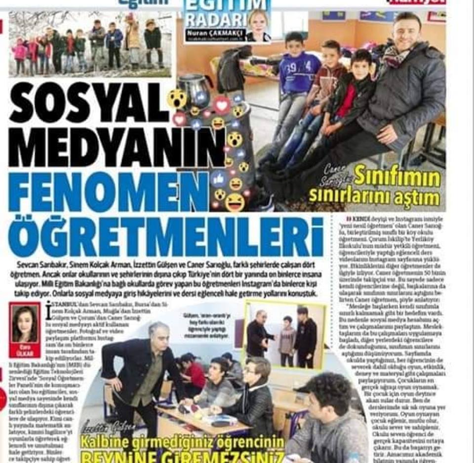 Kendi deyişi ve Instagram ismiyle ‘yeni nesil öğretmen’ olan Caner Sarıoğlu, birleştirilmiş sınıflı bir köy okulu öğretmeni. Çorum İskilip’te Yerliköy İlkokulu’nun müdür yetkili öğretmeni, öğrencileriyle yaptığı eğlenceli ders videolarını Instagram sayfasına yüklüyor. Etkinliklerini diğer öğretmenler de ilgiyle izliyor. Caner öğretmenin 50 binin üzerinde takipçisi var. Bu sayede sadece kendi öğrencilerine değil, başkalarına da ulaşarak sınıfının sınırlarını aştığını belirten Caner öğretmen, şöyle anlatıyor: “Mesleğe başlarken kendi sınıfımla sınırlı kalmamak gibi bir hedefim vardı. Bu nedenle sosyal medya hesabımı açtım ve çalışmalarımı paylaştım. Meslektaşlarım da bu çalışmaları uygulamaya başladı, diğer yerlerdeki öğrencilere de dokunduğumu, sınıfımın sınırlarını aştığımı düşünüyorum. Sayfamda okulda yaptığımız, her öğrencinin de severek dahil olduğu oyun, etkinlik, deney ve materyal gibi çalışmaları paylaşıyorum. Çocukların en gerçek uğraşı oyun oynamak. Bir çocuk için oyun deyince akan sular durur. Ben de derslerimde sık sık oyuna yer veriyorum. Oyun oynayan çocuk eğlenir, mutlu olur, okulu sever ve sahiplenir. Okulu seven öğrenci de gerçek kapasitesini ortaya çıkarır. Bu da başarıyı getirir. Amacımız akademik bilginin yanında öğrencileri ahlaklı, donanımlı bireyler olarak yetiştirmek. Her zaman ‘Eğlenmeyi öğren, öğrenmeyi öğret’ eğitim yaklaşımımla derslerime ağırlık veriyorum. Okulda eğlenen, eğlenirken öğrenen, oyunlar oynayan, bizzat süreçte aktif olan, kendisine saygı duyulan öğrenci okulu ve öğretmenini sever. Sevginin olduğu yerde de iletişim her zaman üst seviyede olur.”