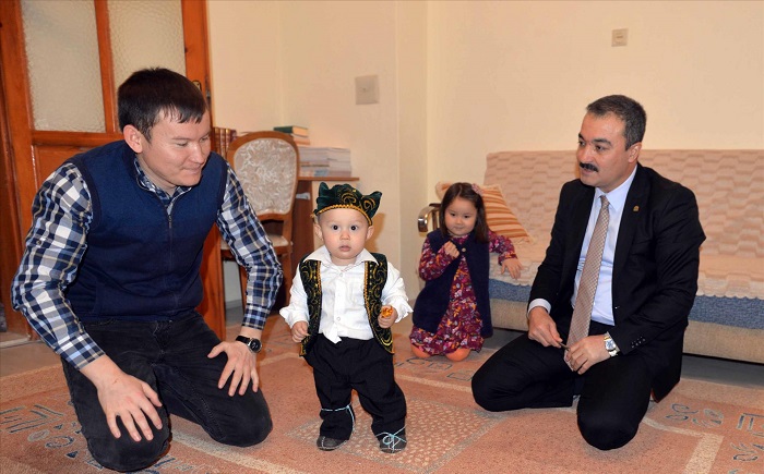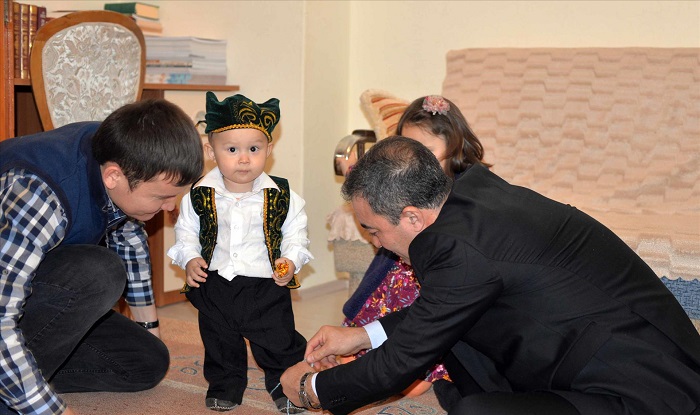 Hitit Üniversitesi Rektörü Prof. Dr. Ali Osman Öztürk, Sosyal Bilimler Enstitüsü’nde yüksek lisans eğitimi gören Kazakistan uyruklu öğrenci Timur Nüsüphan’ın yeni yürümeye başlayan oğlu için düzenlediği “Bağ Kesme” töreninde Nüsüphan ailesini yalnız bırakmadı. Farklı bölgelerinden lisans ve lisansüstü eğitim için Hitit Üniversitesi’ne gelen uluslararası öğrenciler gerek akademik personel gerek üniversite yönetimi tarafından çeşitli vesilelerle ziyaret edilerek sorunları ve mutlulukları paylaşılıyor. Kazakistan’dan eşi ve çocuklarıyla birlikte Çorum’a gelen ve Hitit Üniversitesi Sosyal Bilimler Enstitüsü’nde lisansüstü eğitim gören Timur Nüsüphan, yeni yürümeye başlayan oğlu Muhammet Emin için düzenlediği ve Türk kültüründe “köstek kesme”, “tusau keser”, “tuşoo kesüü” veya “duşak kesme” diye anılan ilk adım törenine, “ata” olarak Rektörümüz Prof. Dr. Öztürk’ü davet etti. Rektör Prof. Dr. Öztürk, öğrencisinin davetini karşılıksız bırakmayarak Nüsüphan ailesinin evinde düzenlediği ilk adın törenine katıldı. Törende Timur Nüsüphan’ın da dombra çaldığı etkinlikte, Kazakistan geleneksel kıyafeti giydirilen 1 yaşındaki Muhammet Emin’in ayağına önce ip bağlandı ve karşısına da dombra, kalem, anahtar konuldu. Adetlere göre daha sonra ailenin bir büyüğü veya bilge bir kişi tarafından kesilmesi gereken Muhammet Emin’in ayaklarına bağlanan ipi, Rektör Prof. Dr. Öztürk, besleme ile kesti. Muhammed Emin, ayağındaki ipin kesilmesinin ardından ilk adımını atarak karşısına konulan hediyelerden dombrayı seçti. Prof. Dr. Öztürk, aldığı davetin kendisi için de çok özel ve anlamlı olduğunu belirterek, “Üniversitemizde eğitim gören tüm öğrencilerimiz başta olmak üzere hususen yabancı öğrencilerimizin kendilerini yalnız hissetmemesi bizim için önemli bir sorumluluktur” dedi. “Biz bu yavrularımızı öğrencimiz olmaktan öte, evlatlarımız ve kendi ailemizin birer ferdi kabul ediyoruz” diyen Prof. Dr. Öztürk, şöyle konuştu: “Öğrencilerimizin gönlünde ailenin bir ferdi gibi kabul edilmemiz bizim en büyük mutluluk kaynağımızdır. Burada kıymetli evladımız Timur Nüsüphan’ın gözbebeği çocuğunun Bağ Kesme töreni için bulunuyoruz. Ömür boyu yürüyeceği hayat yolunun ilim, irfan, sağlık ve karakterlilik üzerine olmasını diliyorum. Allah bahtını açık, ömrünü uzun etsin”. Öğrenci Timur Nüsüphan da kilometrelerce uzaktan geldikleri Çorum’da kendisini yalnız hissetmediğini, Prof. Dr. Öztürk’ün, oğlunun ilk adım törenine davetini kabul ederek katıldığı için çok mutlu olduğunu dile getirdi. “Tüm öğrenciler bana göre sayın hocamızın evlatlarıdır” ifadesini kullanan Nüsüphan, “Biz de Kazakistan’dan ilim tahsili yapmak için geldiğimiz Çorum’da değerli hocamızın babacan ve samimi tavırlarına muhatap olduk. Bizim geleneğimizde bağ kesme töreni çok önemlidir. Bunun anlamı evladımızın ömür yolunu sağlam adımlarla yürüyüp, karakterli, onurlu, vatanına ve milletine faydalı, ilim ve irfan sahibi olmasının kavli duasıdır. Bizi evladı yerine koyup bu davetimize icabet eden hocamız, bizi ve hanemizi şereflendirdi, kendisine minnettarız.” şeklinde konuştu.