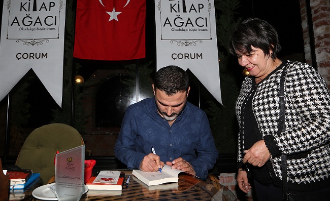 90’lı yılların Diyarbakır’ına odaklanırken, “vadesini doldurmuş” bir cinayet masası polisinin yaşadığı olayları konu alan “Kandan Adam” romanının yanı sıra yazarlık üzerine kendisine yöneltilen soruları içtenlikle cevaplayan yazar Abdullah Aren Çelik, “Küçükken konuşma güçlüğü çekiyordum. Belki de o benim kusurumdu. İnsanlar, kusuru ne ise onun üzerinden derdini anlatmak ve bir şeyler inşa etmek istiyor. Eğer ayağım aksasaydı belki de onun üzerinden bir şeyler yapacaktım. Dert olmadan bir şeyler yazmak zor. Ben çok iyi konuşmayı, çok iyi iletişim kurmayı çok isterdim. Bir sayfalık yazıyı bir cümlede anlatmak isterdim. Hepimiz bir şeyler bırakmak istiyoruz. Sınırsız zamana sahip olduğumuzu düşünüyoruz ama her an her şey olabiliyor bu hayatta.” İfadelerini kullandı. Çelik, her kitabında farklı bir konuyu işlemeyi düşündüğünü, bu yüzden yazacağı diğer kitapların öncekilerden farklı olmasını istediğini söyledi. Çelik, konuşmasının ardından kitaplarını imzaladı. Etkinliğin sonunda Kitap Ağacı Çorum Temsilcileri Zeliha Aksu ve Erdinç Yaşar tarafından yazar Abdullah Aren Çelik ile 7-8 Hasan Paşa Kahvecisi işletmecisi Hasan Kiraz’a teşekkür plaketi takdim edildi.