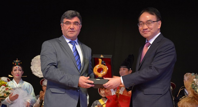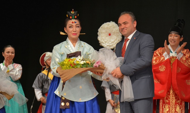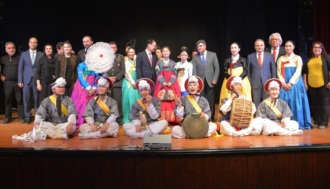Çorum’da Kore Kültür Günü etkinliği kapsamında Devlet Tiyatro Salonu’nda gerçekleştirilen “Kore Geleneksel Müzik ve Dans Gösterisi” büyük beğeni topladı. Kore Büyükelçiliği, Çorum Valiliği ve Hitit Üniversitesi işbirliğiyle hazırlanan programa Çorum Vali Yardımcısı Recep Yüksel, Garnizon Komutanı Per. Alb. Çetin Öcal, Belediye Başkan Yardımcısı Turhan Candan, Hitit Üniversitesi Rektörü R. Metin Alkan, Kore Cumhuriyeti Büyükelçiliği Müsteşarı Dongwoo Cho, Kültür ve Turizm Müdür Vekili İbrahim Yıldız da katıldı. Koreli geleneksel kıyafetli 15 sanatçı tarafından sahnelenen 6 farklı gösteriyi salonu hıncahınç dolduran izleyiciler ilgiyle takip etti. Bir saat süren gösterileriyle Çorumlu izleyicilerin büyük beğenisini toplayan Koreli sanatçılar ayakta alkışlandı. Program sonunda Vali Yardımcısı Recep Yüksel tarafından Kore Cumhuriyeti Büyükelçiliği Müsteşarı Dongwoo Cho’ya Hitit Vazosu hediye edilirken diğer konuk sanatçılara da çiçek takdimi yapıldı. Fotoğraf çektirmek için sahneye akın eden izleyicilerin ilgisi nedeniyle sanatçılar bir süre daha sahneden ayrılamadı.