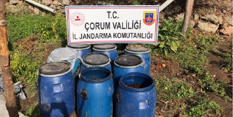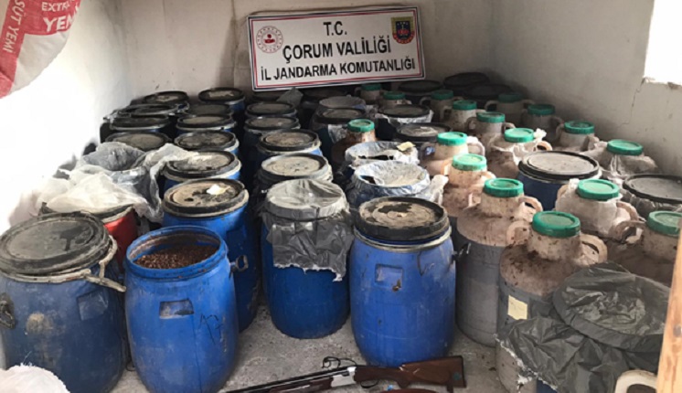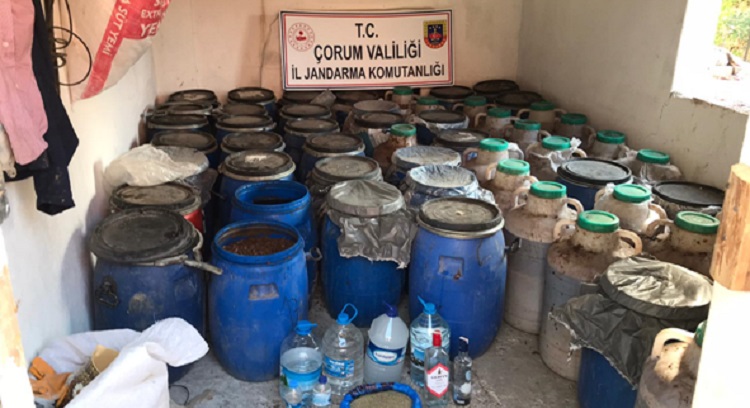 Çorum İl Jandarma Komutanlığınca, halk sağlığını olumsuz yönde etkileyen ve ölümlere neden olan kaçak içki ile mücadele kapsamında yürütülen faaliyetler sonucunda, kaçak içki üretimi yapan ve piyasaya süren adreslere operasyon düzenlendi. Çorum’un Laçin ilçesine bağlı Gökgözler köyünde kaçak/sahte alkollü içki imal edildiği tespit edilen iki ayrı şüpheliye ait ev ve eklentilerinde yapılan aramada; toplam (8.820) litre fermente içki (şarap), (20) litre distile içki (rakı), (2,8) kg anason, (1) adet distilasyon sistemi ve (1) adet ruhsatsız av tüfeği ele geçirildi. Şüpheli şahıslar ile ilgili adli işlemler devam ediyor.