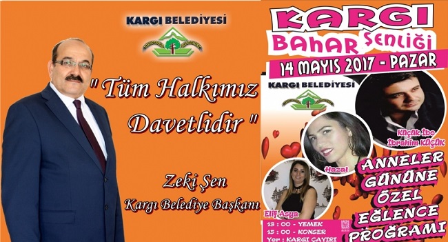 Kargı Belediye Başkanı Zeki Şen, ” Bahar Şenlikleri ” adı altında Anneler Gününe özel program düzenlediklerini belirtirken herkesi etkinliğe davet etti. Kargı Belediyesi tarafından düzenlenen program, 14 Mayıs 2017 Pazar günü çayır mevkinde gerçekleşecek. Program saat 13.00 de yemek ikramıyla başlayıp, saat 15.00 de ise konser ile devam edecek. İbrahim Küçük (Küçük İbo), Hazal ve Elif Asya’nın sesleri ile renk katacağı konser akşam saatlerine kadar devam edecek. Kargı Belediye Başkanı Zeki Şen yaptığı açıklamada; ” Bahar şenlikleri adı altında, anneler gününe özel bir program düzenleyerek, bayanlarımızın bu özel günde unutulmadıklarını göstererek, eğlenmelerini sağlamak istedik. İkramlarımızla başlayacak programda, çok değerli seslerde güne renk katacak. Şimdiden tüm annelerin Anneler gününü kutluyorum.” dedi.
