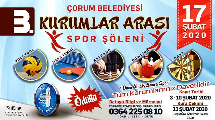 Çorum Belediyesi tarafından düzenlenen Kurumlar Arası Spor Şöleni yoğun katılımla gerçekleşecek. Her yıl geleneksel olarak düzenlediği ve bu yıl 3.sünün yapılacağı Kurumlar Arası Spor Şöleninde Bin 195 kişi mücadele edecek. 36 kurumdan Bin 51 erkek, 114 kadının yarışacağı spor şöleni 17 Şubat’ta başlayacak. Amaçlarının sporu yaşam biçimi haline getirmek olduğunu ve sporu tüm kesimlere sevdirmeyi hedeflediklerini söyleyen Belediye Başkanı Dr. Halil İbrahim Aşgın, üçüncüsünü düzenledikleri kurumlar arası spor şöleninde voleybol, masa tenisi, satranç, bowling ve dart branşlarda müsabakaların yer alacağı belirtti. Her yıl katılımcı sayısının arttığına vurgu yapan Başkan Aşgın, “İlçelerimizden de katılım sağladığımız şölenimiz 17 Şubat’ta bowling yarışmaları ile başlayacak. Müsabakalarda önemli olan kardeşlik hukukunun ön plana çıkmasıdır. Dostluğun yarıştığı, centilmence mücadele edildiği bir müsabaka olmasını temenni ediyorum. Şimdiden tüm katılımcılarımıza başarılar diliyorum” dedi. 3 Kurumlar Arası Spor Şöleninde yarışacak takımlar kura çekti. Turgut Özal İş Merkezi Belediye Konferans Salonunda Başkan Yardımcısı Turhan Candan ve Gençlik ve Spor İl Müdürü Haşim Eğer’in katıldığı programda müsabaka günleri ve saatleri belirlendi.