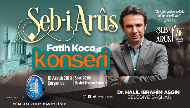 Çorum Belediyesi, Hz. Mevlana’nın 746. Vuslat Yıldönümü (Şeb-i Arûs) nedeniyle anma etkinleri düzenliyor. Hz. Mevlana’yı anma etkinlikleri kapsamında 2008 yılından itibaren TRT 1, TRT AVAZ ve TRT DİYANET’te Ramazan Programlarının değişmez ismi olan ve Ülkemiz Hâfız ve Mûsikîşinaslarının konuk olduğu TRT DİYANET’te yaptığı “Bâd-ı Sabâ” programı büyük beğeni toplayan sanatçı Fatih Koca sevilen eserleriyle Çorumlularla buluşacak. Belediye Başkanı Halil İbrahim Aşgın yaptığı açıklamada “Çorum Belediyesi olarak bizlerde Hz. Mevlana’yı anma etkinlikleri kapsamında ekranların sevilen isimlerinden sanatçı Fatih Koca’yı 18 Aralık 2019 Çarşamba günü Saat 20.00’da hemşehrilerimizle buluşturacağız. Bu güzel etkinliğimize tüm hemşehrilerimizi davet ediyorum” dedi.