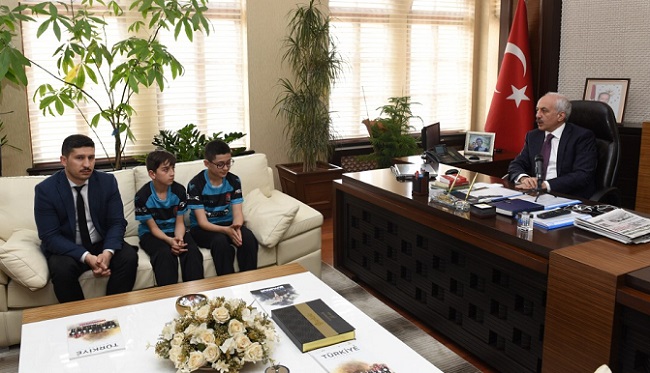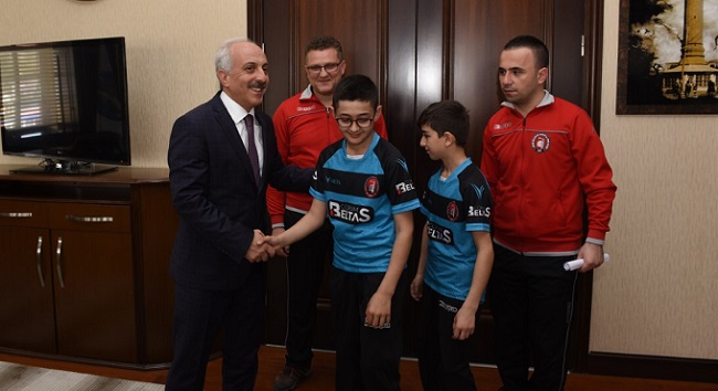 Lüksemburg’da gerçekleştirilecek olan Eurokids Avrupa Seçmeleri’nde mücadele edecek olan Çorum Belediyesi Gençlik ve Spor Kulübü sporcuları Belediye Başkanı Zeki Gül’ü ziyaret etti. Geçtiğimiz yıl mücadele ettikleri Türkiye Şampiyonası’nda sergiledikleri performans ile tüm dikkatleri üzerine çekmeyi başaran Uğurcan Dursun ve Arda Kekillioğlu, 1 – 9 Nisan tarihleri arasında Avrupa Masa Tenisi Birliği (ETTU) tarafından Lüksemburg’da yapılacak olan Eurokids Avrupa seçmelerinde milli takımda görev yapacak. Ziyarette Çorum Belediyesi Spor İşleri Müdürü Nadir Solak, Antrenör Ali Korkmaz ve sporcular yer aldı. Masa Tenisi Antrenörü Ali Korkmaz Belediye Başkanı Zeki Gül’e gidecekleri kamp hakkında bilgiler verdi. İki sporcunun 2017 yılı Temmuz ayı içerisinde yaklaşık 1 ay boyunca Çin’de kamp yaptıklarını belirten Belediye Başkanı Zeki Gül, sporcuların çok iyi bir gelişim sergilediğini ve dünyanın en iyi organizasyonları arasında yer alan Eurokids Avrupa Seçmelerinde milli takımda görev yapacaklarını söyledi. Türkiye’den sadece Çorum Belediyesi Gençlik ve Spor Kulübü’nden sporcuların bu organizasyona davet edildiğinin altını çizen Başkan Gül, “Birçok büyükşehir ve büyük takım sporcularının arasından 2 sporcumuz seçildi. Uğurcan Dursun ve Arda Kekillioğlu’nun Avrupa’nın en iyi sporcu seçmesine katılması bizi Çorum Belediyesi olarak ve Çorum Belediyesi Gençlik ve Spor Kulübü olarak son derece memnun etti. Sporcularımızı ve antrenörlerini tebrik ediyorum. Başarıları inşallah daim olur” ifadelerine yer verdi.