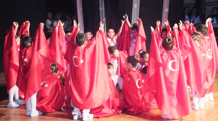 Minikler, kırmızı-beyaz renkli, Türk bayraklı pelerinleri ve Atatürk posterli tişörtleri ile sahne de gösteri yaparken, Livza Buğlem Köse isimli minik öğrencinin okuduğu İstiklal Marşı izleyenlere duygulu anlar yaşattı.