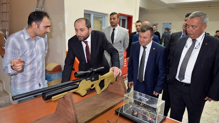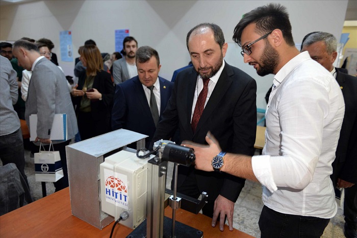 Hitit Üniversitesi Mühendislik Fakültesi öğrencilerinin Makine Mühendisliği Laboratuvarı-II dersi kapsamında yapmış oldukları projeler bölüm öğretim üyeleri Doç. Dr. Sinan Çalışkan ve Öğr. Gör. Dr. Emir Avcıoğlu tarafından yürütülen Mühendislik Fakültesi Proje Sergisi’nde tanıtıldı. Toplam 25 projenin yer aldığı sergiyi Rektör Yardımcıları Prof. Dr. Mustafa Bıyık ve Prof. Dr. Nurcan Baykam ile birlikte ziyaret eden Rektör Prof. Dr. Reha Metin Alkan, öğrencilerden projeleri hakkında bilgiler aldı. İnceleme sonrasından açıklamalarda bulunan Rektör Prof. Dr. Reha Metin Alkan, Üniversitenin üniversite-sanayi işbirliği kapsamındaki en önemli lokomotif birimlerinden birisi olan Mühendislik Fakültesi’nde bu tür çalışmaların yapılmasından dolayı büyük mutluluk duyduğunu ifade ederek uygulamaya dönük, uygulamalı çalışma ve eğitimlerin çok önemli olduğuna inandığını belirtti. Ülkemizin geleceğini şu an üniversitelerimizde eğitim alan gençlerimizin şekillendireceğini ve ihtiyacımız olan milli teknoloji ile ürünlerin de gençlerimiz tarafından üretileceğinin altını çizen Alkan, “Ülkemizin 2023 vizyonuna ulaşması ve dünyada sayılı güç haline gelebilmemiz için üniversite-sanayi iş birliğini kurmamız gerekiyor. Bu da çok kolay bir iş değil. Bu etkinlikler öğrencilerimizin projelerini iş dünyasıyla buluşturmaya dönük olan çalışmalardır. Biz öğrencilerimizin daha mezun olmadan ilgili sektörlere proje üretmeleri yönünde teşvik ediyoruz. Öğrencilerimizin büyük başarılara imza atacağına yürekten inanıyoruz” diyerek başta Mühendislik Fakültesi Dekanı Prof. Dr. Ali Kılıçarslan olmak üzere emeği geçen tüm öğretim elemanlarına teşekkür etti.