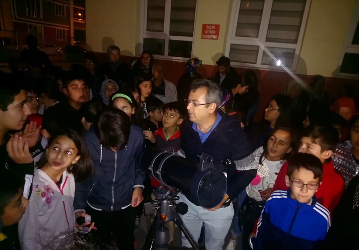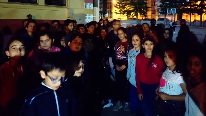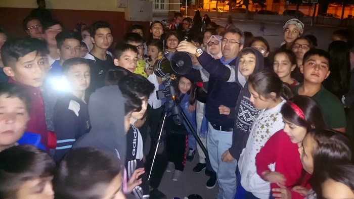 Cumhuriyet Ortaokulu Müdürü Aytekin Ağırcan ve Fen Bilimleri Öğretmeni Ünsal Berk, öğrencilere ve mahalle sakinlerine gece dersi yaptı. Ünsal Berk, kendisine ait teleskopu okul bahçesine kurarak, öğrencilerine ayı izletti ve ay hakkında bilgiler verdi. Okul bahçesinde neler olduğunu merak eden mahalle sakinlerinin de katıldığı gece dersinde, herkes teleskopla bakma imkanı buldu. Etkinlikten memnuniyetlerini dile getiren veliler, “Bilim böyle sevdirilir çocuklara” yorumunu yaptı.
