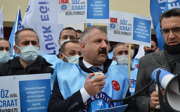 Türk Eğitim-Sen, ülke genelinde eş zamanlı Öğretmenlik Meslek Kanunu ile ilgili eylem yaptı. Çorum’da da Türk Eğitim Sen Çorum Şubesi, Milli Eğitim Müdürlüğü önünde meslek kanunun yanı sıra eğitim çalışanlarının ekonomik kayıplarının telafi edilmesi için taleplerini anlattı. Türk Eğitim Sen Çorum Şubesi, 2022 bütçe görüşmelerinin tamamlanmasıyla birlikte öğretmenlik meslek kanunu TBMM gündemine getirilmesi ve yasalaştırılması için eylem yaptı. Türk Eğitim Sen bugün ülke genelinde eş zamanlı Öğretmenlik Meslek Kanunu ile ilgili eylem yaptı. Çorum’da da Türk Eğitim Sen Çorum Şubesi, Milli Eğitim Müdürlüğü önünde meslek kanunun yanı sıra eğitim çalışanlarının ekonomik kayıplarının telafi edilmesi için taleplerini açıkladı. Öğretmenlik mesleğinin saygınlığını artıran ve mesleğin statüsünü sağlam bir zemine kavuşturacak bir meslek kanunu talep ettiklerini vurgulayan Türk Eğitim-Sen Çorum Şube Başkanı Selim Aydın, “Öğretmenlik Meslek Kanunu’nu desteklediğimizi ifade etmiştik. Tabi bu desteğimiz, devlet memuru olmamız hasebiyle sahip olduğumuz mevcut hak ve kazanımlarımızın baki kalması kaydıyla olacaktır. Öte yandan hazırlıkları tamamlandığı söylenen Meslek Kanunu’nun eğitimin paydaşlarıyla henüz paylaşılmamış olmasını da anlayabilmiş değiliz. Kapalı kapılar arkasında süreç yürütülmesini kabul etmiyoruz. Meslek Kanunu’nun bir an önce paydaşlar ve kamuoyu ile paylaşılması noktasında Bakanlık’tan bir an önce adım atmasını bekliyoruz” ifadelerini kullandı. Meslek Kanunu’nda olmasını talep ettikleri hususları anlatan Aydın, şunları söyledi: “Halen öğretmenler kadrolu, sözleşmeli, ücretli olarak üç modelle istihdam edilmektedir. Aynı işi yapan öğretmenlerin farklı statüde istihdamı hem eğitimimize vurulan bir darbedir hem de öğretmenlik mesleğinin geleceğini zedelemektedir.