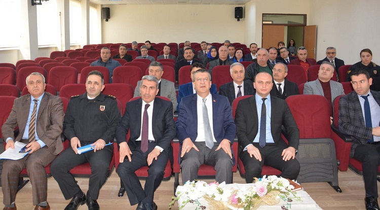 2019-2020 Eğitim-Öğretim yılı Okul Güvenlik Toplantısı Vali Yardımcısı Tamer Orhan başkanlığında Milli Eğitim İl Müdürlüğü toplantı salonunda gerçekleştirildi. Okullarda Güvenliğin Sağlanması, Uyuşturucu ile Mücadele, Çocuklarımızın Güvenli Bir Şekilde Servislerle Taşınması, İhtiyaçların Tespiti gibi konuların konuşulduğu toplantıda Vali Yardımcısı Tamer Orhan, İl Milli Eğitim Müdürü Yakup Sarı, Şube Müdürü Hasan Kuyumcu, İl Jandarma ve İl Emniyet Müdürlüğünden yetkililer ile ilgili daire amirleri, okul müdürleri ve okul aile birliği üyeleri hazır bulundu. Sarı ” Okul güvenliği paydaşları, geleceğimizin teminatı olan çocuklarımızın, okula gitmek için evlerinden ayrılmasından başlayarak evlerine dönünceye kadar ki zaman içerisinde güvenli bir eğitim ve öğretim hayatı geçirmelerini, muhtemel şiddet olayları ile madde bağımlılığı ve diğer zararlı alışkanlıklardan korunmalarını, çağın gereklerine uygun güvenli eğitim ortamlarının sağlanarak ülkemize yararlı bireyler olarak yetişmelerini sağlamak, hepimizin birinci amacıdır” diye açıklamada bulundu. Sarı, okul güvenliği ve alınması gereken önlemlerle ilgili açıklamalarda bulunduktan sonra, yöneltilen sorular ile ilgili gerekli bilgilendirmeler yapıldı ve toplantı sonlandırıldı.