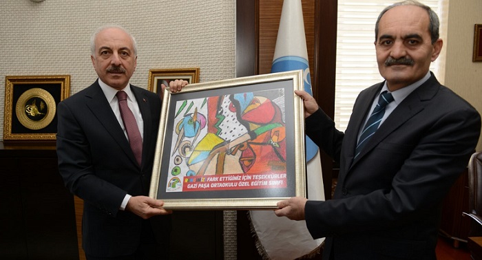 Çorum Gazipaşa Ortaokulu Özel Eğitim Sınıfı öğrencileri, Okul Müdürü Yaşar Kabakcı, Özel Eğitim Sınıf Öğretmenleri Ayşenur Maral Yıldız ve Salih Demirci ile birlikte Belediye Başkanı Zeki Gül’e teşekkür ziyaretinde bulundu. Çorum Belediyesi’nin ”Benim Rengimi Fark Et ” projesine verdiği destek için öğrencilerin bizzat Belediye Başkanı Zeki Gül’e teşekkür etmek istediğini ifade eden Okul Müdürü Yaşar Kabakcı, “Çorum Belediyesi eğitimi her alanda destekliyor ama özel eğitim alanında bizi hiçbir zaman desteksiz bırakmadı. Bütün öğrenciler ve veliler adına Belediye Başkanımız Zeki Gül’e teşekkür ediyorum” diye konuştu. “Özel eğitime ihtiyaç duyan öğrencilerin kendileri için özel bir öneme haiz olduklarının altını çizen” Belediye Başkanı Zeki Gül, “eğitimin her aşamasında destek vermeye devam edeceklerini ifade etti ve ziyaretleri için öğrencilere ve öğretmenlerimize teşekkür ediyorum” diye konuştu. Okul Müdürü Yaşar Kabakcı, öğrencilerin kendi yaptıkları tabloyu Başkan Gül’e hediye etti.