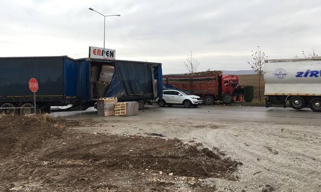 Çorum’da bakliyat yüklü tırla şeker pancarı taşıyan kamyonun çarpışması sonucu meydana gelen kazada kamyon şoförü yaralandı. Kaza nedeniyle yol bir süre trafiğe kapandı. Alınan bilgiye göre, bakliyat yüklü tır, Çorum Organize Sanayi Kavşağı Tüvtürk yakınlarında şeker pancarı yüklü kamyonla çarpıştı. Kazada yaralanan kamyon şoförü olay yerine çağrılan ambulansla Hitit Üniversitesi Erol Olçok Eğitim ve Araştırma Hastanesi’ne kaldırıldı. Çarpmanın etkisiyle devrilen kamyondan yola dökülen şeker pancarları ile tırdaki malzemeler yapılan çalışmanın ardından temizlendi. Kaza nedeniyle yol bir süre trafiğe kapatılırken polis kazaya ilişkin soruşturma başlattı.