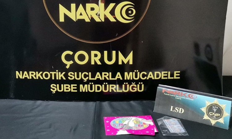 Çorum İl Emniyet Müdürlüğü Narkotik Suçlarla Mücadele Şube Müdürlüğüne gelen “Hollanda’dan Dodurga ilçesine posta yolu ile uyuşturucu gönderildiği” bilgisi üzerine yapılan çalışmalarda; 22/02/2021 günü iki şahıs Dodurga İlçesi PTT Şubesinde, içerisinde uyuşturucu bulunan zarf ile birlikte yakalandılar. Yapılan arama sonucunda; – 0,7 cm x 0,7 cm ebatlarında 60 adet (Liserjik Asit Dietilamid) maddesi emdirilmiş kullanıma hazır halüsüonejik madde ele geçirildi. Operasyon sonucunda “TCK 188 Uyuşturucu Madde İthal Etme” suçundan Osmancık Adliyesine sevk edilen (2) şüpheli “Adli Kontrol Kararı” ile serbest bırakıldı.