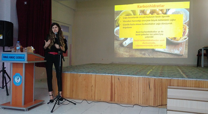 Çorum merkez İsmail Kakaç İlkokulu’nda Diyetisyen Elif İrem Umuç tarafından velilere yönelik “Çocukluk Çağında Beslenme” konulu seminer gerçekleştirdi. Okul Müdürü Ender Özcan Özçakır “Beslenme, çocukların sağlığını, dolayısıyla tüm hayatını etkileyen önemli bir konu. Beslenme hepimizin yaşam kalitesini doğrudan etkileyen bir kavram. Sağlıklı beslenme çocukların okul başarısını da doğrudan etkiler. Çocuğumuza yapacağımız en büyük yatırım onlara sağlıklı ve dengeli beslenme alışkanlığı kazandırmak ve bu konuda bilinçli yetiştirmektir. Bizleri kırmayan ve çok kıymetli zamanını sizler için ayıran Diyetisyen Elif İrem Umuç’a sizlerin huzurunda teşekkür ediyorum dedi. Sağlıklı beslenmeyi tanımlayarak sunuma başlayan Umuç, ´Sağlıklı ve Dengeli Beslenmenin Önemi ve çocukların gelişimine etkileri, çocuk ve ergenlerin günlük ihtiyacı olan besin grupları, çocuklarda sağlıklı beslenme kültürü oluşturma, zararlı alışkanlıklardan uzak durma, obezite vb. konulara değindi. Sunum sırasında dinleyicilerin sorularını cevaplayan Elif İrem Umuç, seminer sonunda bireysel olarak soruları cevaplayarak velilere beslenme konusunda rehberlik hizmeti sundu.