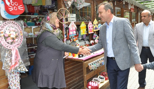 AK Parti Çorum Milletvekili Ahmet Sami Ceylan, Pir Baba Parkı yanında bulunan Sanat Sokağı’nı ziyaret etti. AK Parti İl Başkan Yardımcısı İdris Keskin ve Merkez İlçe Başkan Yardımcısı Muharrem Eker’in de hazır bulunduğu ziyarette Ceylan, esnafı tek tek ziyaret ederek, yaptıkları çalışmalar hakkında bilgi aldı. Unutulmaya yüz tutmuş sanatların Çorum’a kazandırmalarından dolayı Sanat Sokağı esnafına teşekkür eden Ceylan, el emeği göz nuru eserleri de yakından inceledi. 24 Haziran seçimleri içinde destek isteyen Ceylan, doların yükseltilmesinin esnaf ve vatandaşlar arasında bir tedirgin yaratmaktan başka bir şey olmadığını ifade ederek, “Asıl hedef, bizleri parçalamaktır.” şeklinde konuştu. Aynı oyunların Rusya’da yapıldığını anlatan Ceylan, “Birlik olarak bu oyunları bozmak için sizlerin de desteğini bekliyoruz” dedi. Ziyaretlerinden dolayı Milletvekili Ceylan’a teşekkür eden Sanat Sokağı esnafı ise sokağın tuvalet sorunu olduğunu kaydederek, yardım istedi. Bunun üzerine telefonla yetkilileri arayan Ceylan ise sıkıntının biran önce çözüme kavuşturulması için talimatlar verdi.