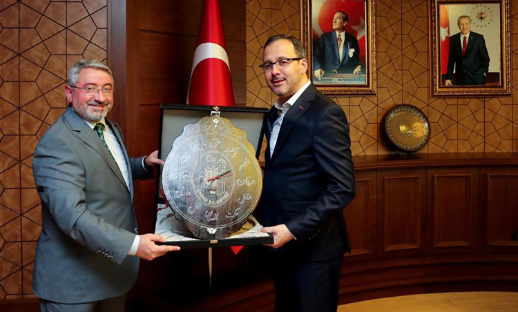 Çorum Belediye Başkanı Dr. Halil İbrahim, Gençlik ve Spor Bakanı Dr. Mehmet Muharrem Kasapoğlu’nu ziyaret etti. Aşgın, ”Çorum’umuzun spor yatırımları üzerine çok verimli bir toplantı gerçekleştirdik” dedi. Kasapoğlunun makamında gerçekleştirilen görüşmede Çorum gençliğini spora yönlendirmek ve spor faaliyetlerinin bilfiil devam etmesi için fikir alışverişinde bulunuldu. Bakan Kasapoğlu’na Dr. Halil İbrahim Aşgın tarafından detaylı bir dosya sunularak Çorum’a yapılacak spor yatırımları için alt zemin oluşturuldu. Gençlik ve Spor Bakanı Dr. Mehmet Muharrem Kasapoğlu, dosyayı inceleyeceğini ve Çorum için yapılması gerekenlerin titizlikle yapılacağını belirtti. Ziyarette Aşgın, tarafından Bakan Kasapoğlu’na hediye takdim edildi.