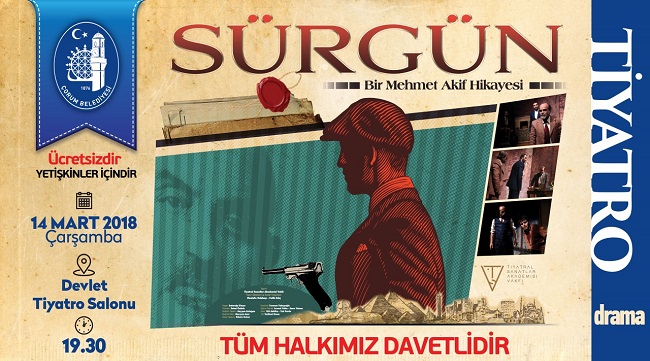 İstiklal Marşı’nın kabulünün 97. Yılı münasebetiyle Çorum Belediyesi tarafından Mehmet Akif Ersoy’un hayatının anlatıldığı “Sürgün” adlı tiyatro oyunu sahnelenecek. Sürgün adlı tiyatro oyunu hakkında bilgi veren Belediye Başkan Yardımcısı Turhan Candan, Mehmet Akif Ersoy’un hayatında yaşadığı en çileli günleri konu alan “Sürgün” adlı tiyatro oyununa tüm Çorum halkını davet etti. Baturalp Dinçer’in yazdığı, Zuhal Öztürk’ün yönettiği, oyunculuklarını ise İbrahim Öner, Fatih Altun, Aydan Çakır, Ergin Düzgün, Emre Akarsu, Serra Tankal, Ecem Yılmaz, Mustafa Haki Karakaya, Barış Çağlar ve Ali Suvacı’nın Mehmet Akif Ersoy’un hayatının anlatıldığı Tiyatral Sanatlar Akademisi Vakfı’nın sahneye koyduğu Sürgün adlı oyun 14 Mart Çarşamba akşamı saat 19.30’da Devlet Tiyatro Salonu’nda ücretsiz olarak sahnelenecek.