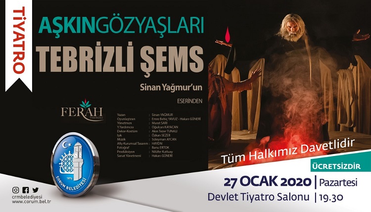 Çorum Belediyesi, kültür ve sanat etkinliklerine kapsamında Tebrizli Şems tiyatro oyununu Çorumlu sanatseverlerle buluşturacak. Çorum Belediyesi Kültür ve Sosyal İşler Müdürlüğü tarafından düzenlenecek etkinlikte Sinan Yağmur’un aynı adlı eserinden uyarlanan Aşkın Gözyaşları – Tebrizli Şems adlı tiyatro oyunu Çorumlularla buluşacak. 27 Ocak Pazartesi günü saat 19.30’da Devlet Tiyatro Salonunda sahnelenecek oyunla ilgili bilgiler veren Belediye Başkan Yardımcısı İsmail Yağbat, Mevlana Celaleddin Rumi’nin hayatından kesitlerin yer aldığı oyunun iki perdelik olduğunu söyledi. Hz. Mevlana’nın düşüncelerini anlamanın ve anlatmanın önemine değinen Yağbat, Çorumlu sanatseverlerle buluşturacakları tiyatro oyununda da Tebrizli Şems’in genç yaşlarından itibaren peşinde olduğu “aşkı bulma” serüveninde çatıştığı fikirler ve durumların konu edindiğini sözlerine ekledi.
