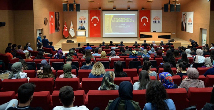 Hitit Üniversitesi Sosyal Bilimler Meslek Yüksekokulu’nda Çorum Müftüsü Muharrem Biçer tarafından “Bütün Yönleriyle Hz. Muhammed” konulu konferans verildi. Konferansa, Rektör Prof. Dr. Ali Osman Öztürk, Rektör Yardımcısı Prof. Dr. Halil İbrahim Şimşek, akademik ve idari personel ile öğrenciler katıldı. Konferansın açılışında konuşan Rektör Prof. Dr. Ali Osman Öztürk, sözlerine Türk Silahlı Kuvvetleri’nin, Suriye’nin kuzeyinde terör örgütlerine yönelik başlattığı Barış Pınarı Harekatı’na katılan askerlerimize Allah’tan yardım dileyerek başladı. Türk askerini tanımlayan Mehmetçik adının, Peygamberimiz Hz. Muhammed Mustafa’dan alındığını belirten Prof. Dr. Öztürk, “Dualarımızla, Mehmetçiğimizin yanındayız, yanında olmaya devam edeceğiz” dedi. Dr. Öztürk, Hz. Muhammed’i bütün yönleriyle anlatmak için bir konferans süresinin yeterli olmayacağını belirterek, “Peygamberimizin en azından insan olarak, hayatının önemli dönemlerini, yaşadığı güzellikler ve zorlukları, hayatımıza yansıtacağımız güzelliklerini paylaşmak ve bunlardan ders çıkarmak üzere aramızda bulunan kıymetli Müftümüze çok teşekkür ediyorum” ifadesini kullandı. İl Müftüsü Muharrem Biçer, “Bütün Yönleriyle Hz. Muhammed” konulu konferans verdi. Konferansta, Hz. Muhammed’in hayatına dair kesitler sunan Biçer, “Hz. Peygamberi sevebilmek için onu iyi tanımak gerekir. Bazılarının yaptığı gibi putlaştırmadan, sıradanlaştırmadan içimizden biri olarak, onu en iyi şekilde sevmeyi öğrenmeliyiz” dedi. Hz. Muhammed’in kadınlara karşı nazik davrandığını, ölen kuşu için bir çocuğa taziye ziyaretine gidecek kadar duygusal biri olduğunu anlatan Biçer, “Peygamberimiz hayatı ölçülü yaşardı. İbadette de dünya işinde de ölçülü davranırdı” diye konuştu.