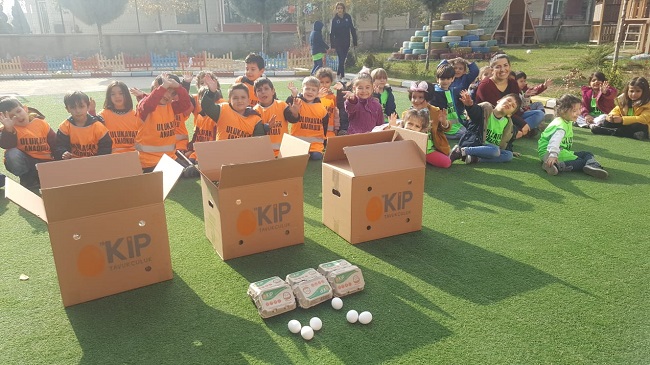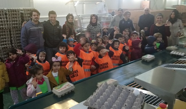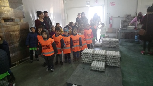 Ulukavak Anaokulu 5-6 yaş grubu öğrencileri tavuk çiftliğine gitti. Kip Tavukçuluk Firmasına düzenlenen geziye katılan yaklaşık 120 öğrenci, yumurta sofralarına gelmeden önce geçirdiği süreci adım adım görme fırsatı buldu. Tavukların yumurtlamasından, yumurtaların paketlenmesine kadar her adımı tek tek inceleyen öğrenciler, şaşkınlıklarını gizleyemedi. Ulukavak Anaokulu öğretmenleri, “Doğadan Öğreniyorum” projesi kapsamında 2018-2019 öğretim yılı boyunca her hafta öğrencilerini bir geziye götürerek, doğadan öğrenmelerini sağlamaya karar verdi. Proje kapsamında, Sıklık Tabiat Parkı, Kentpark ve Yunus Emre Parkı gibi ilimizin park ve mesire yerlerine doğa yürüyüşleri düzenleyen okul, son gezisinde farklı bir etkinliğe imza attı. Çorum–İskilip Yolu 10. Kilometrede bulunan Kip Tavukçuluk firmasını ziyaret eden öğrenciler, yumurta sofralarına gelmeden önce geçirdiği süreci adım adım gözlemledi. Firma yetkililerinden Mehmet Kip’in rehberlik ettiği gezide önce tavukların arasına giren öğrenciler, tesisin bu bölümünde tavukların nerede tutulduğunu ve nasıl yumurtladığını, yumurtaların nerede biriktirildiğini incelediler. Yumurtaların tesisin diğer bölümlerine geçirilmesinde kullanılan tünelleri gördüklerinde şaşkınlıklarını gizleyemeyen öğrenciler, bazı yumurtaların tünellerden düşmesi üzerine kısa süreli bir panik yaşadılar ve bu durumu hemen eğlenceye dönüştürdüler. Öğrenciler, kalite kontrol ve paketleme bölümünde yapılan işlemleri de inceledikten sonra, Kip Tavukçuluk firmasının kendilerine hediye ettiği birer paket yumurta ile tesisten ayrıldılar.
