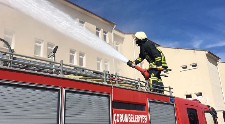 Çorum Merkez 80.Yıl Cumhuriyet Ortaokulu’nda yapılan yangın tatbikatı gerçeğini aratmadı. Okulda öğrenci, öğretmen, Çorum Belediyesi itfaiye ekipleri ve sağlık ekiplerinin katılımıyla yangın tatbikatı yapıldı. İtfaiye ekipleri ilk olarak öğrencilere yangın sırasında yapmaları gerekenler konusunda bilgi verildi. İtfaiye yetkililerinin verdiği kısa bilgilerin ardından tüm okul çalışanları ve öğrencileriyle uygulamalı tatbikata geçildi. Tatbikat gereği çalan siren sesi ile sınıfta bırakılan öğrenciler dışında, diğer öğrencilerin ve çalışanların okulu boşaltmaları sağlandı. 35 saniyede öğrenciler okulu boşaltarak toplanma alanında bir araya geldi. Sınıflarda tatbikat gereği mahsur bırakılan diğer öğrenciler ise itfaiye ekipleri tarafından kurtarılarak sedye ile 112 Acil Servis ambulanslarına taşındı. Tatbikatın son aşamasında itfaiye ekipleri tarafından öğrencilere yangın tüpü kullanımı anlatıldı ve uygulamalı olarak yangın söndürülmesi gösterildi. Öğrenciler bu eğitici ve eğlenceli faaliyet ile birlikte yangın konusunda acil durum tecrübesi kazanmış oldu. Okul Müdürü Ali Ateş, “Tatbikatımıza katılan tüm öğrencilerimize, bu konuda okulumuzdan desteğini esirgemeyen Çorum Belediyesi İtfaiye ekibine ve sivil savunma kulübünde görevli öğretmeni Mürsel Şimşek´ e katkılarından dolayı teşekkürlerimizi sunarız” dedi.