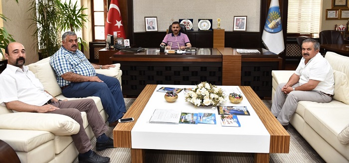 Çorum Kasaplar ve Celepler Odası Başkanı Recep Gür, oda üyeleriyle birlikte Çorum Belediye Başkanı Muzaffer Külcü’yü ziyaret etti. Gür, yapımı devam eden yeni hayvan pazarı için Başkan Külcü’ye teşekkür etti. Ziyaretten duyduğu memnuniyeti dile getiren Belediye Başkanı Muzaffer Külcü, yaptıkları tüm çalışmaları işin ilgilisi olan kişi, kurum ve kuruluşlarla istişare ettiklerini vurgulayarak “Gerek yeni hayvan pazarı gerekse yapılacak olan mezbahane ile ilgili olarak Kasaplar ve Celepler Odası, Ziraat Odası ve Ticaret Odası ile birlikte karar alarak bu işleri yaptık” dedi. Yeni hayvan pazarının her anlamda eskisinden çok çok iyi olacağını ifade eden Başkan Külcü, “Eski hayvan pazarı 20 dönümlük bir alan üzerindeydi ve esnafımız çok ilkel şartlarda çalışmak zorunda kalıyordu. Bize, Çorum’umuza yakışmıyordu. Yeni hayvan pazarımızı eskisinden yaklaşık 5 kat büyüklüğünde yeni bir alana taşıyacağız. İnşallah hem şehrimizi o kötü görüntüden kurtarmış olacağız hem de sağlık imkânları bakımından da daha nezih bir ortama kavuşturmuş olacağız.” dedi. Kasaplar ve Celepler Odası Başkanı Recep Gür de yaptığı konuşmada yapımı hızla devam eden yeni hayvan pazarının Kurban Bayramına yetişmesinin kendilerini mutlu edeceğini belirterek hayvan pazarının tamamlandığında Çorum’a ve bölgeye yakışır bir yer olacağını, yeni hayvan pazarı ile birlikte Çorum’un hayvancılıkta pilot bölge olacağına inandığını vurguladı.