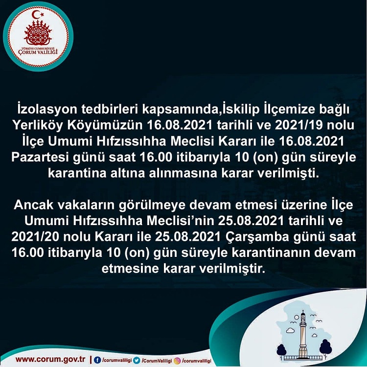 İskilip İlçesi’ne bağlı Yerliköy’de yaşanan korona virüs salgını nedeniyle alınan karantina kararı vakaların devam etmesi nedeniyle uzatıldı. İzolasyon tedbirleri kapsamında 16 Ağustos 2021 tarihinde İlçe Umumi Hıfzıssıhha Meclisi karanı ile 10 gün süreyle karantinaya alınan Yerliköy’de vakaların görülmeye devam etmesi üzerine karantina kararını 25 Ağustos 2021 Çarşamba gününden itibaren 10 gün süreyle uzattı.