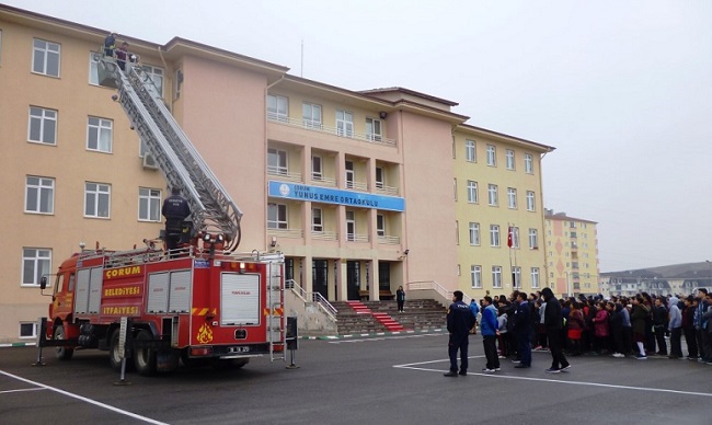 Çorum Merkez Yunus Emre Ortaokulu’nda ‘Sivil Savunma Haftası’ etkinlikleri kapsamında yangın tatbikatı yapıldı. Okul Sivil Savunma Kulübü tarafından irtibat kurulan Çorum Belediyesi İtfaiyesi Yetkilileri okula davet edildi. Yetkililer tarafından eğitim semineri verilerek daha sonra tüm öğretmen ve öğrencilerin katılımıyla okul bahçesinde yangın tatbikatı gerçekleştirildi. ‘Yangın nasıl söndürülür?’, ‘yangın tüpü nasıl çalıştırılır’, ‘hangi yangında ne tür söndürme aracı kullanılır?’ gibi konularında öğretmen ve öğrencilere verilen eğitim büyük ilgi gördü. Okul Müdürü Tülay Coşkuner yaptığı açıklamada “değerli katılımları için Çorum itfaiye yetkililerine ve emeği geçen tüm öğretmenlerimize, öğrencilerimize teşekkür ederiz” dedi.